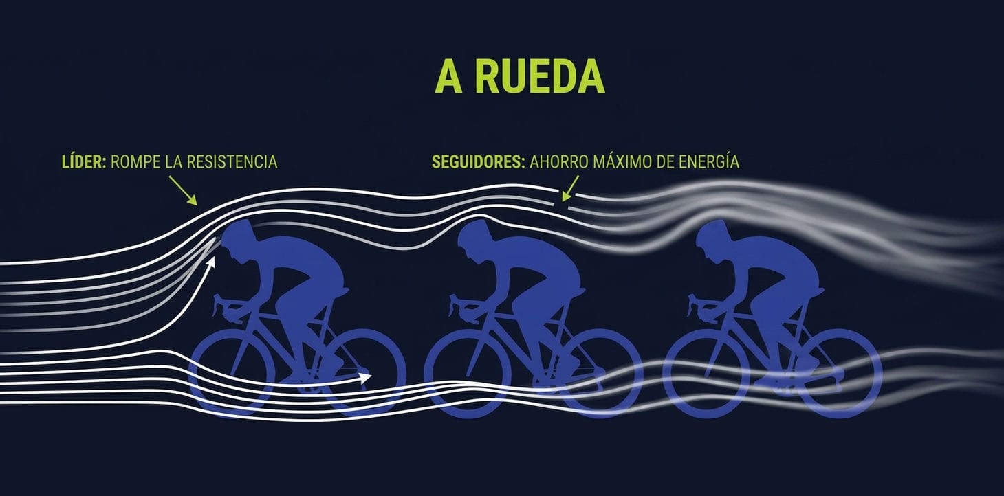 Cuando ruedas detrás de otro ciclista, ese corredor es quien se ocupa de romper el aire. Él absorbe la mayor parte de la resistencia aerodinámica, y tú, desde su estela, avanzas a la misma velocidad gastando mucha menos energía. A eso se le llama ir a rueda (drafting).